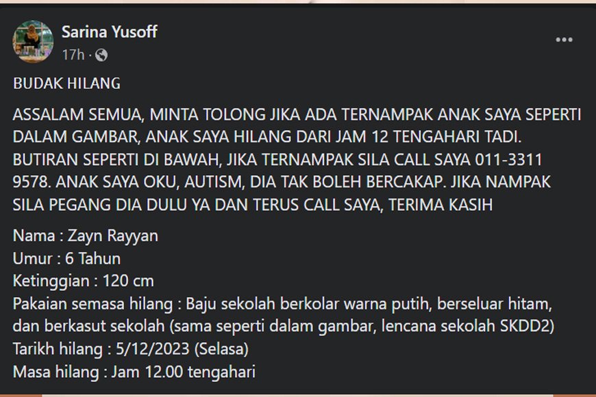 Ibunya berkongsi di Facebook mengenai kehilangan Zayn Rayyan yang dikatakan masih berpakaian seragam sekolah.