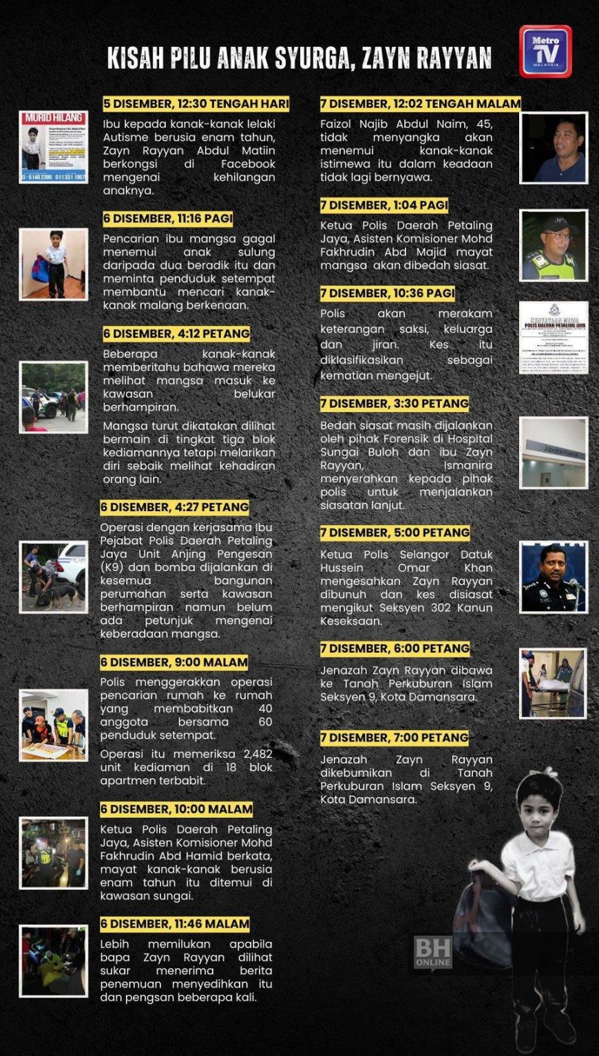 Berikut adalah kronologi kehilangan sehinggalah mayat Zayn Rayyan ditemui malam kelmarin: