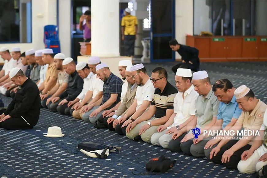 Exco Komunikasi dan Multimedia, Belia, Sukan dan Badan-badan Bukan Kerajaan Negeri Pahang, YB. Fadzli Mohamad Kamal bersama pelancong sempena Pengenalan Pelancong Mesra Muslim dari China menunaikan solat zohor berjemaah di Masjid Sultan Haji Ahmad Shah Bentong